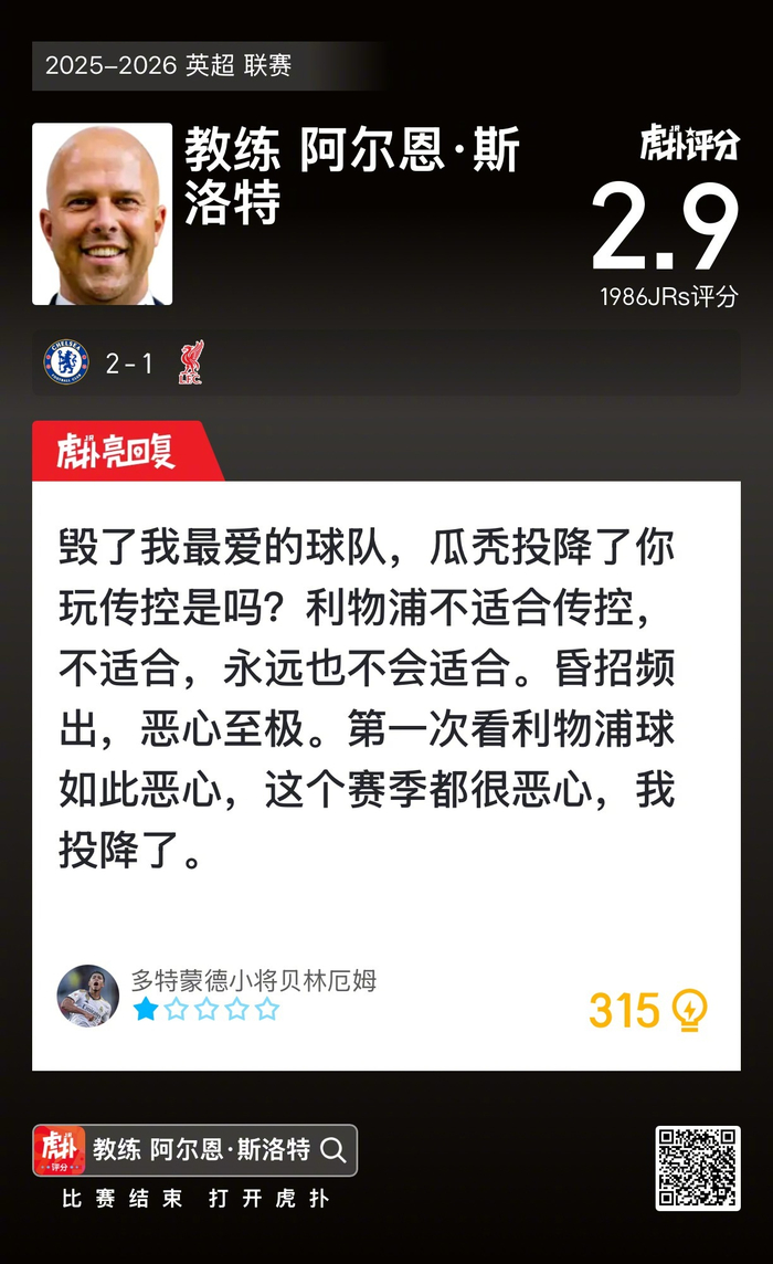 赛后的评分雷人得像是在玩笑,2.9分直接把斯洛特往谷底拉。虎扑网友的弹幕炸了锅,大家都在问这评分是根据啥标准来的,是不是背后有故事?球员的状态明明在线啊,怎么能给这么个尴尬的分?有人说评分系统自己脑抽,也有人怀疑有水分,反正一片骂声连连,评分这事儿,真得好好梳理一波。